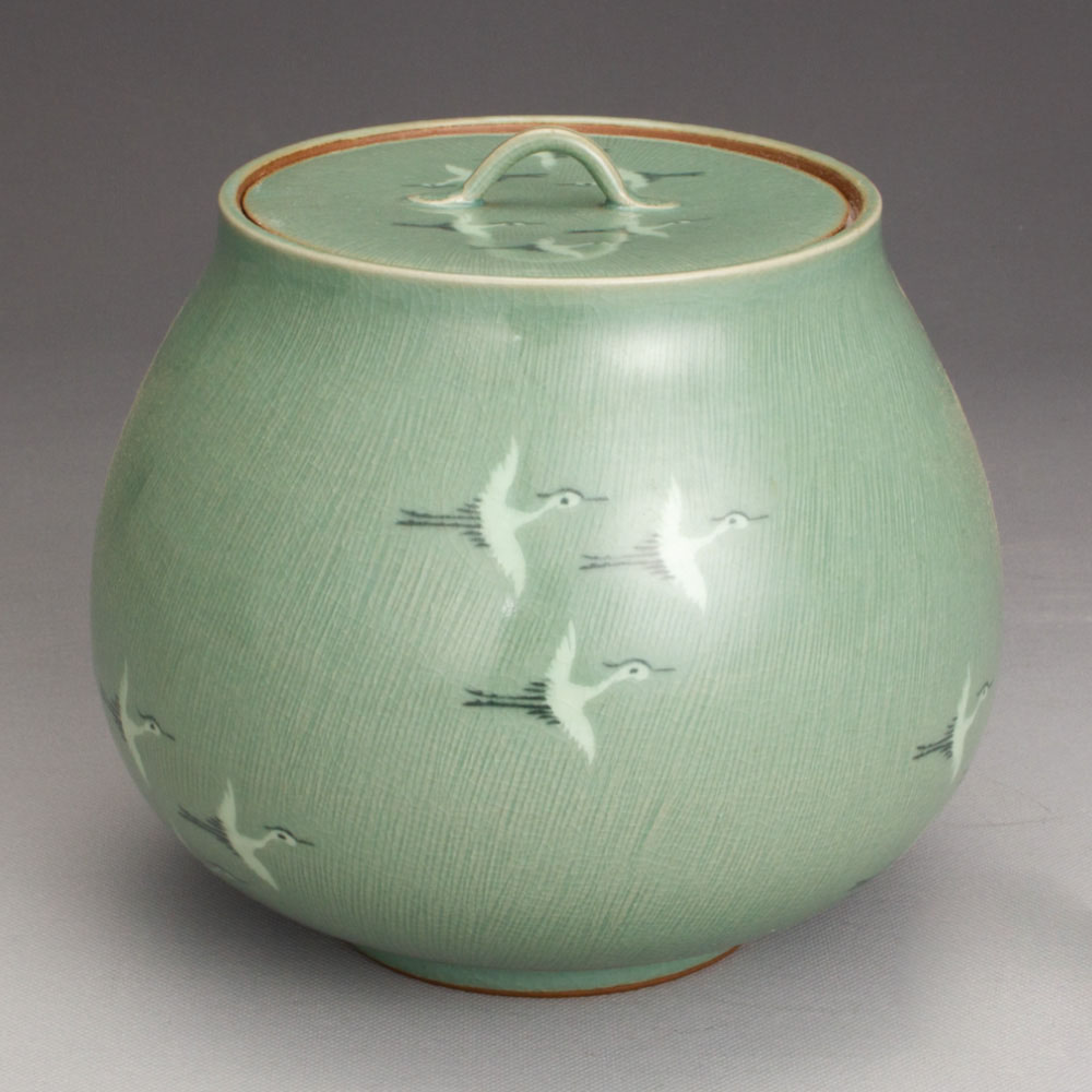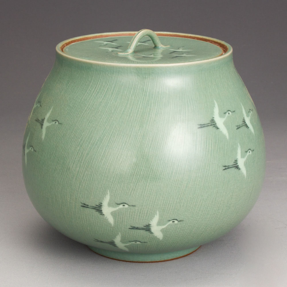 This unique Korean celadon porcelain cookie jar is inlaid with flying cranes design. The freely flying crane designs representing eternity, combined with the color of autumn sky, gives the viewer the sensation of looking at a piece of heaven. Read More