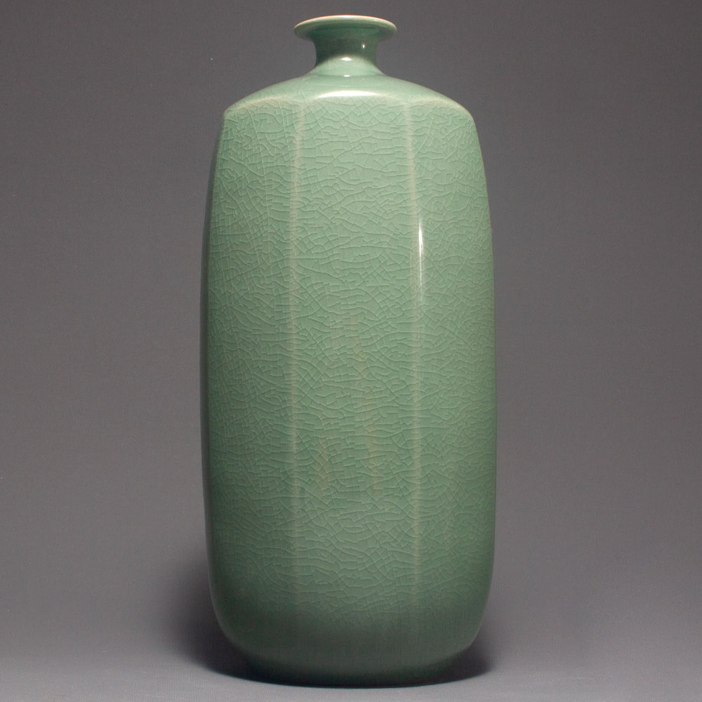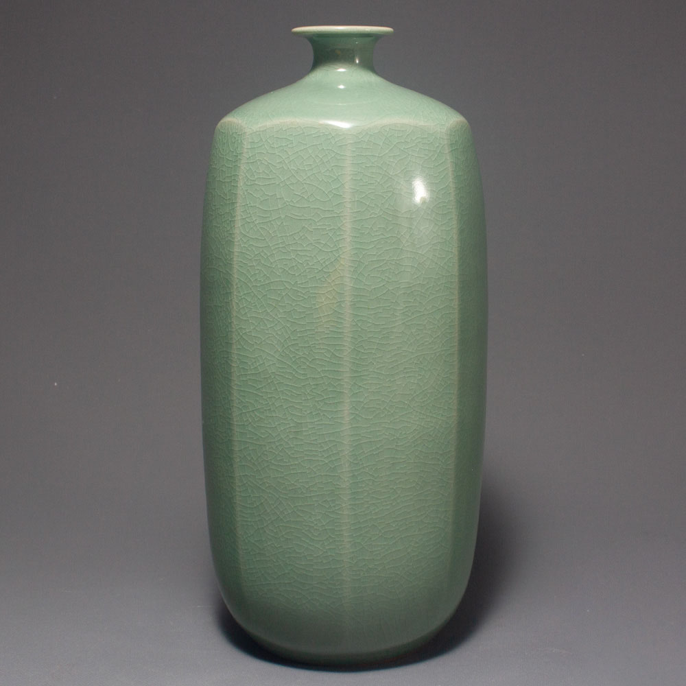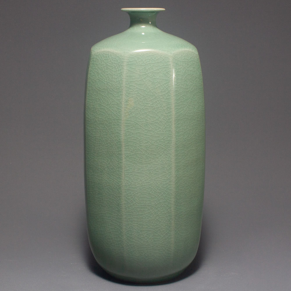This celadon porcelain vase features a unique octagonal body on a pure green-glazed body.