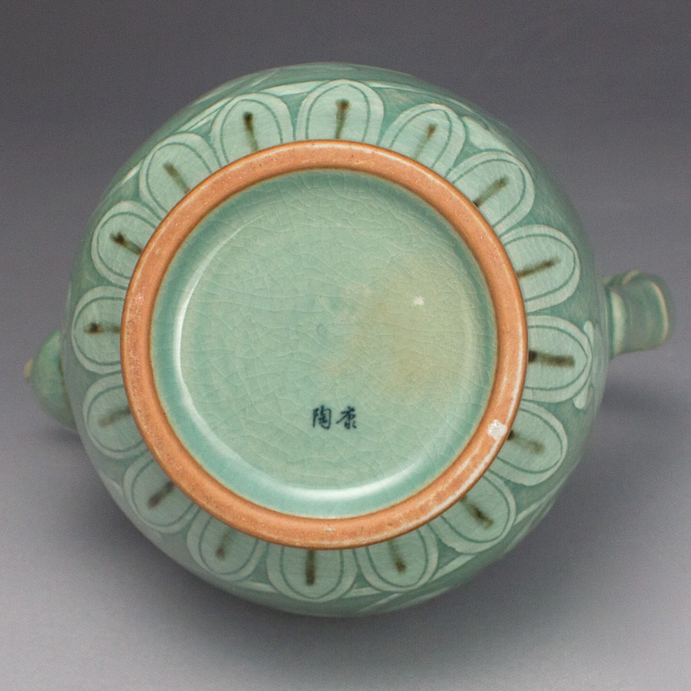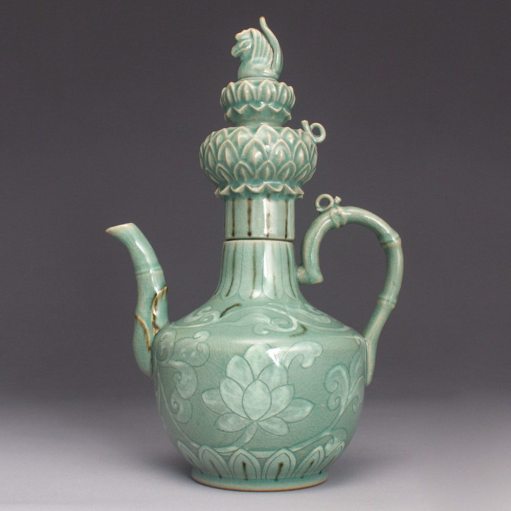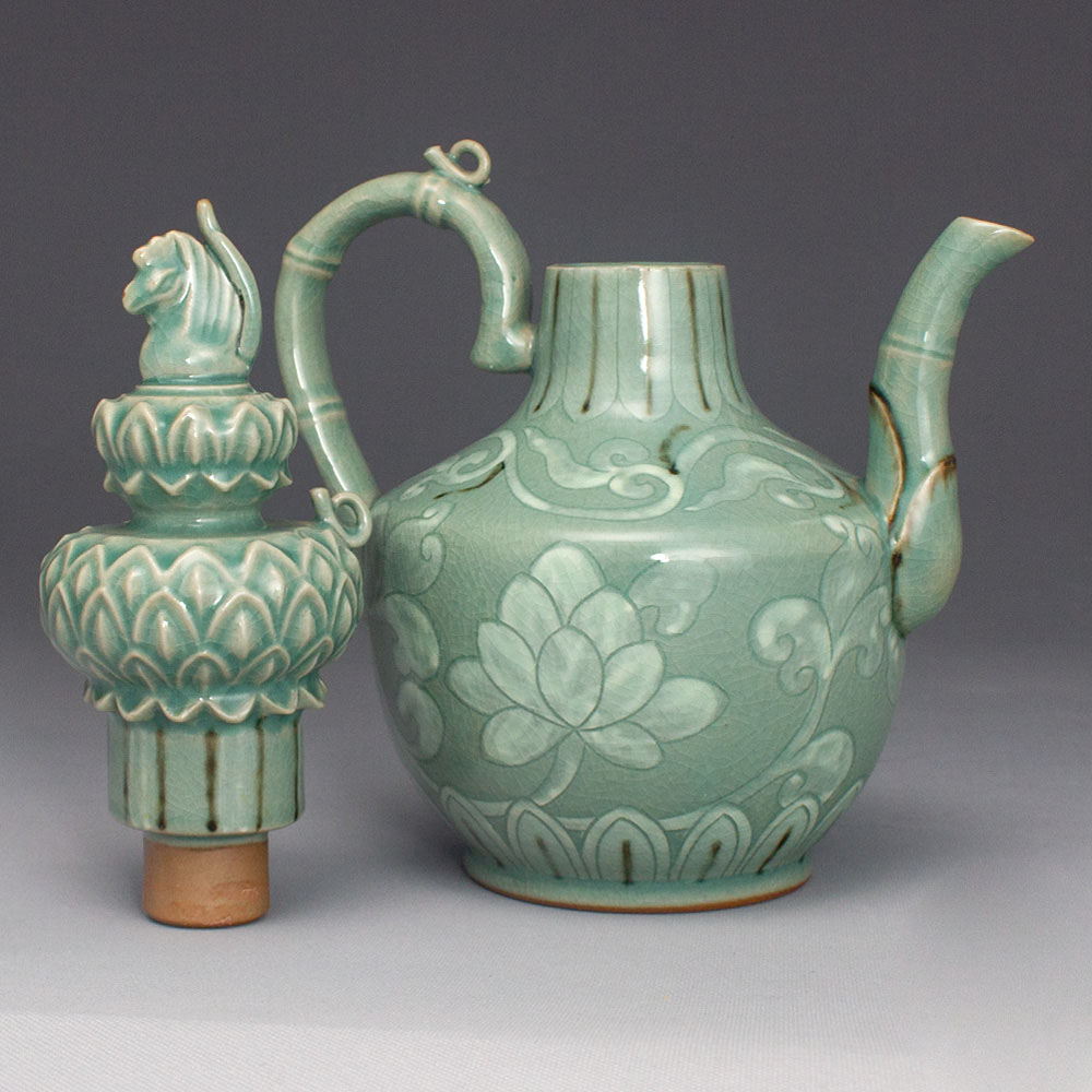 This jug is a reproduction of a Goryeo Dynasty ((918-1392)) work housed in the National Museum of Korea. It is a jug characterized by a phoenix-decorated lid, a bamboo-stem-shaped handle, and a spout. The lid depicts a phoenix with its wings raised on a two-tiered lotus seat, and the lotus leaves are emphasized with white clay. The neck is decorated with vertical lines in black clay, and the lower part is decorated with a lotus leaf pattern in white clay. The body is painted with a lotus vine pattern in white clay to express it in large size, and the outline and details of the pattern are emphasized with engraving. The spout and handle feel taut as if they were actually made from broken bamboo. The glaze on the bottom was wiped off and the five places were supported with refractory clay to fire it. A similar metal jug from the Goryeo-era is housed in the Boston Museum of Art in the United States, which provides good data for considering the influence of Goryeo celadon and metalware. In addition, the metal jug housed in the Boston Museum of Art has a standing plate, so it is thought that this jug originally had a standing plate.