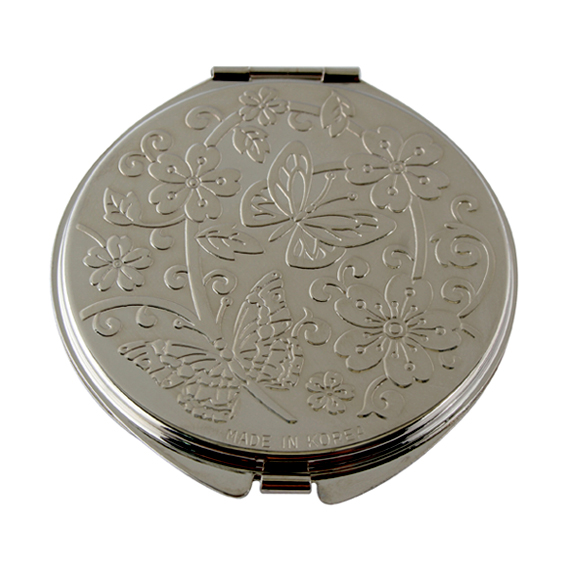 The embossed pattern on the backside surface, which helps prevent slipping, adds beautiful panache to this compact mirror.