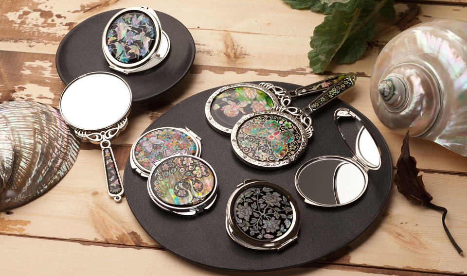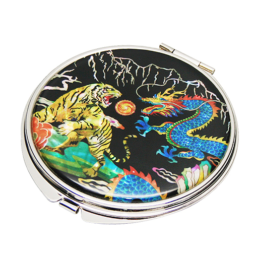 This unique mother of pearl tiger and dragon design compact mirror illustrates two animals contending for a Yeouiju, a magic pearl that is believed to give its holder the magical power of making any wish come true.